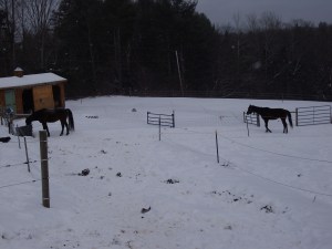 My vet was out today and looked him over. Besides being underweight and slightly dehydrated, she thought there were no serious issues and thought some outdoor exercise would do him good. She did not recommend adding him to the herd just yet, but acknowledged that I might not necessarily follow her guidelines to the letter;) True to her word, I set about freeing Bogie as soon as she left the barn. I locked up Manny and Reno and turned Bogie out with Doc, my retiree. As I expected, there was no drama at all. I let Reno out and he was alittle pushy and bossy, but not persistently so. Finally I let the alpha out….Manny. He surprised me completely. In stead of being his usual nasty self, he investigated the new horse…softly (almost protectively) and moved him here then there. He was just showing the new guy who was boss….but he wasn’t doing it in a very aggressive way (which has been his style in the past). So I am optimistic that Bogie will be able to join the herd permanently very soon. One of the things I love about my track (I have a 15 foot track around the pasture next to the barn) is that there is nowhere for anyone to get stuck…..they just keep moving on the track in a circle…there is always a place for them to go.