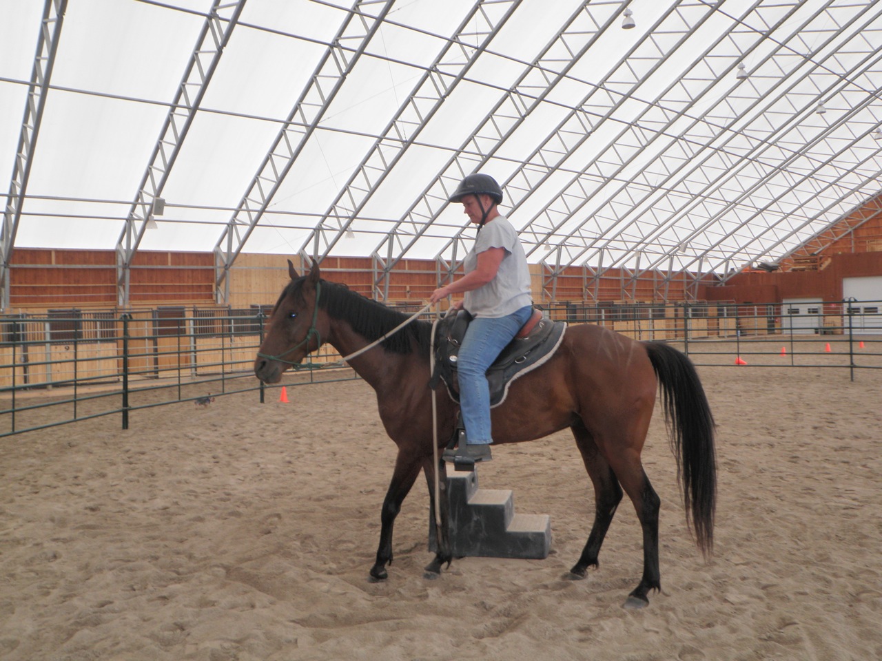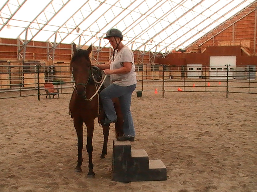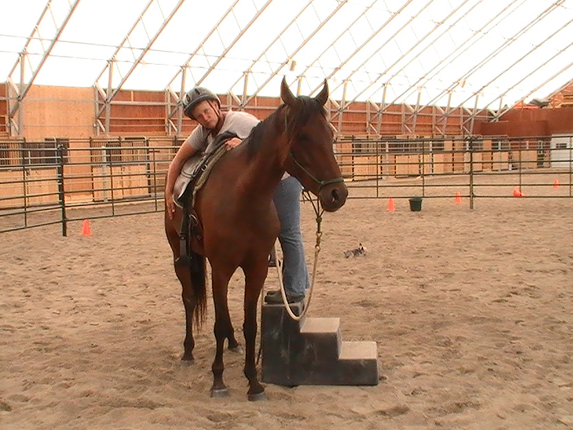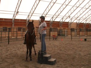 Day two:  I knew I could get on Bogie the second day, based on what we had accomplished the day before.  So I went straight to work teaching him to pick me up at the mounting block.   OK for those of you, saying ‘What’s with the mounting block?’… I have a rule.   Either mount from the ground or teach your horse to pick you up from a block or a tailgate or a fence…willingly.  Mounting a 16 hand horse from the ground takes physical strength and flexibility. Teaching that horse to pick me up takes savvy and focus.   Its ALL good, people!