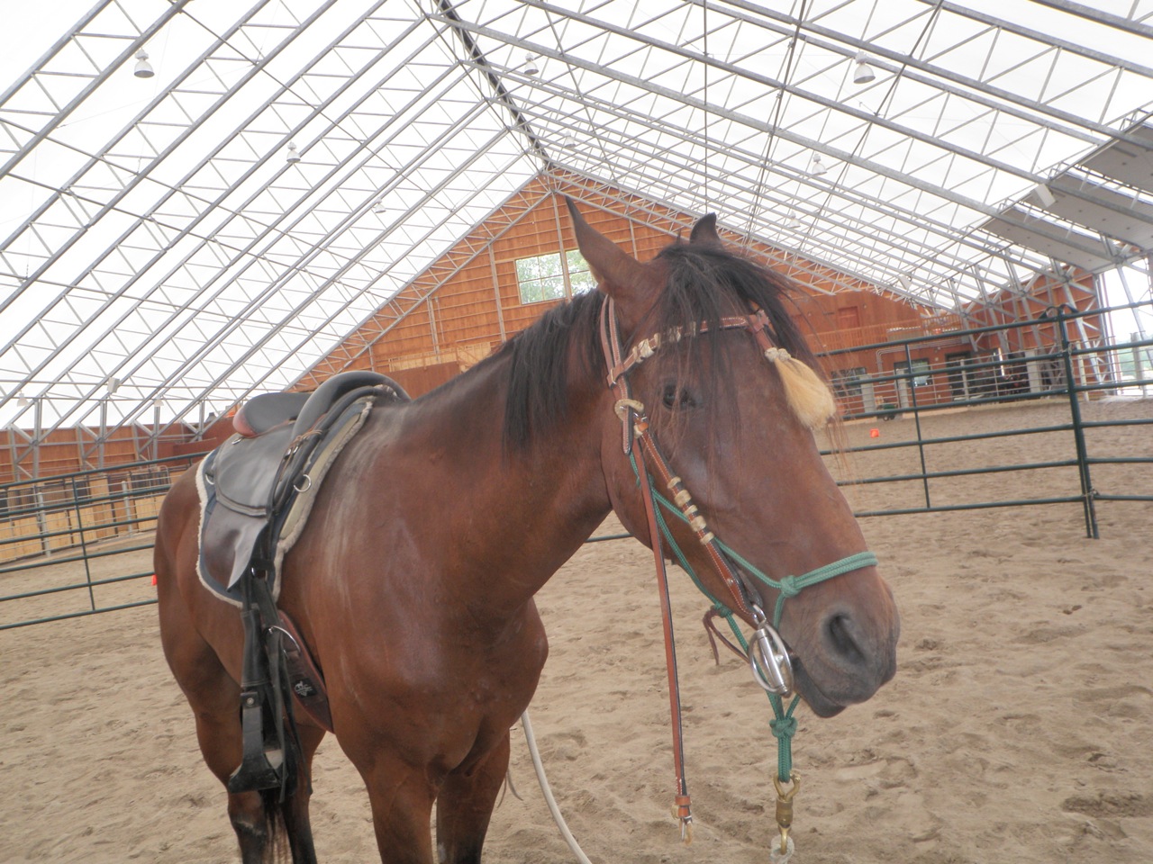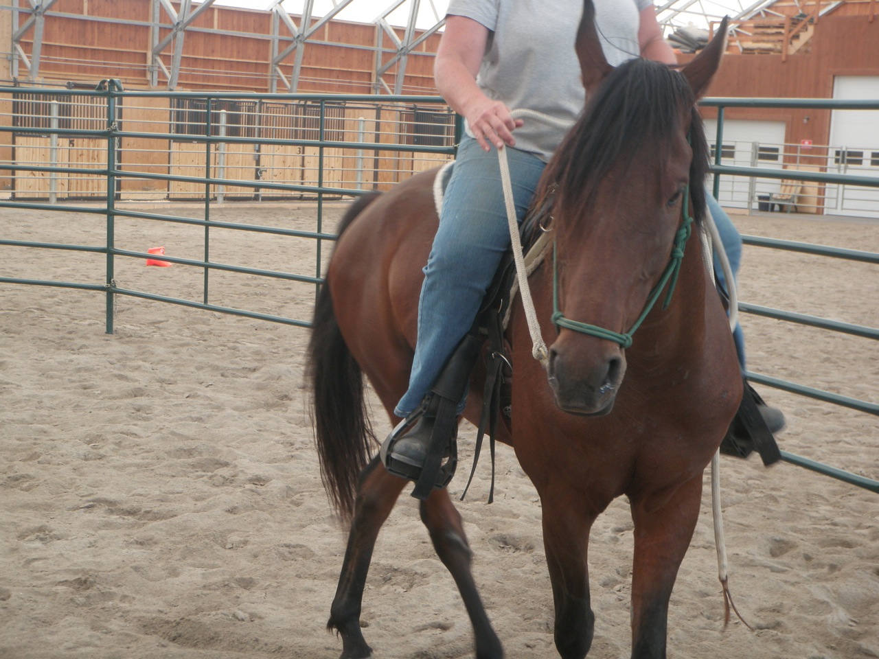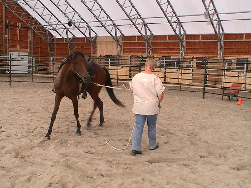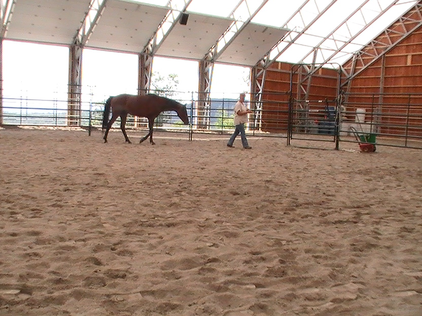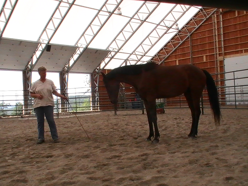 We worked in a round pen.  I used the pen to create forward movement and then worked on changes of direction.  Bogie had trouble at times turning towards me.  Brenda suggested I approach him less directly and push his hindquarters away, allowing the front end to come towards me…brilliant!  At first he could only yield a step at a time before stalling, but before too long he would follow through with forward movement toward me.  We built on that the first day till  he was following me consistently.  Next we had to tackle the friendly game with the stick and string.  I elected to put him on line for this and we played with some approach and retreat.  He caught on very quickly.  It was pretty clear that he is a quick minded horse and does not need alot of repetition to learn.  Brenda thought, ‘why don’t we do this with a saddle on’…kill two birds so to speak.  Now I know he has worn a saddle before, but what I don’t know is if he had any issues with the saddling process or with the saddle itself.  So we treated him like any young horse.  He checked out the saddle and pad and seemed very confident about it.  I saddled him at liberty and he had no problems at all.  Well, I should say, until the next day, when in anticipation of riding him, we found a girth that was small enough for him (he is still not that round).  Since it was our second saddling and he was so good the first day, I didn’t expect any reaction to the girth being tight.  And there wasn’t at first.  I tightened the girth, then walked away and he set off crow hopping around the arena for 20 seconds or so.  I was so surprised.  He then stopped and walked over to me and put his head down as if to say, ‘sorry, I just had a moment there’.  Just goes to show…never make assumptions about any horse and their previous training.  If you didn’t see it with your own eyes, it never happened.