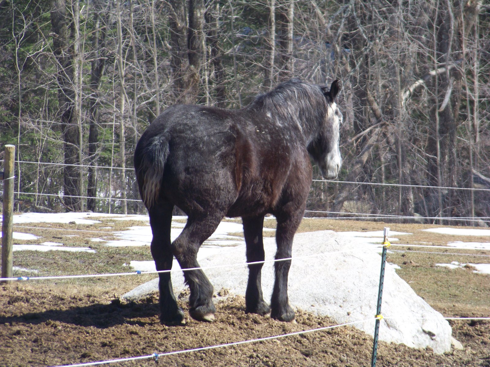 Last weekend, as I was cleaning up the paddock, it occured to me that Reno looked bored. Since he was moving so well, I decided to let him over to the main track with my main herd for a visit. They had known him from over the fence, for 2 months now, so I knew it would be no big deal. Well, he froliced…quite literally….playing with my belgian youngster. I was amazed to watch him trot, canter and gallop soundly. He even did a sliding stop that made my heart skip a beat…worried that he might re-injure himself. But he handled the exercise very well and seemed quite happy to have the social interaction.