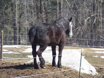Reno is a 5 year old Percheron gelding. Trained and worked in harness regularly, Reno came in from the pasture lame one day. No one really knows what happened. Just a blown up hock and a lame horse. For several weeks he would improve then appear to reinjure himself in a frustrating downward spiral.